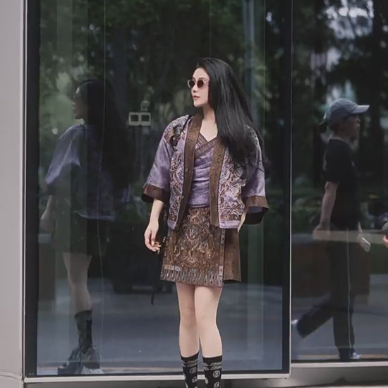 Shrouded in deep violet and mystery, this look redefines silk heritage with cinematic presence. The intricate center embroidery draws inspiration from ancient ceremonial insignias, while the voluminous hood and cloak silhouette echo timeless strength. With every thread of Xiangyun silk, Zouxin Silk invites the modern woman to wear power with poetry — fluid, feminine, and fiercely rooted in culture.
