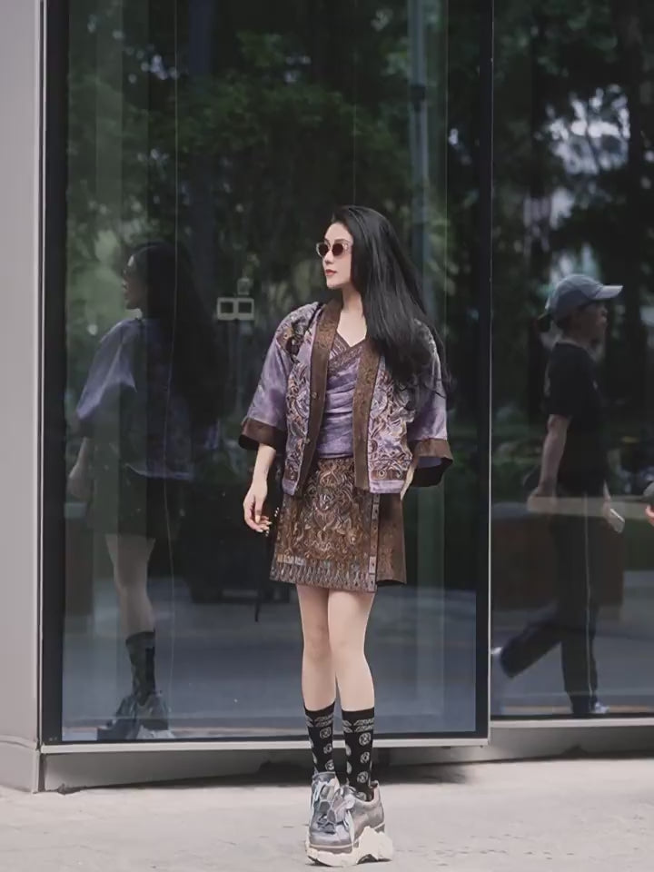 Crafted in jet-black Xiangyun silk with violet-gold twin phoenix embroidery, this look channels the spirit of ancient guardianship and modern rebellion. Every motif whispers of legacy — twin birds in flight, sacred geometry, and auspicious flora — all arranged in a masterful fusion of street ease and ceremonial power.