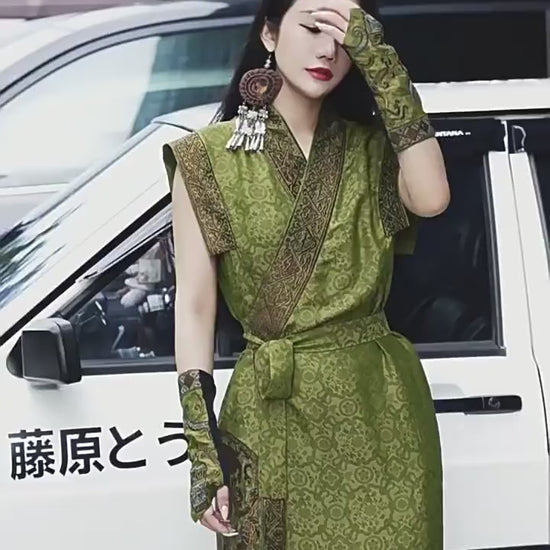 Crafted in jet-black Xiangyun silk with violet-gold twin phoenix embroidery, this look channels the spirit of ancient guardianship and modern rebellion. Every motif whispers of legacy — twin birds in flight, sacred geometry, and auspicious flora — all arranged in a masterful fusion of street ease and ceremonial power.
